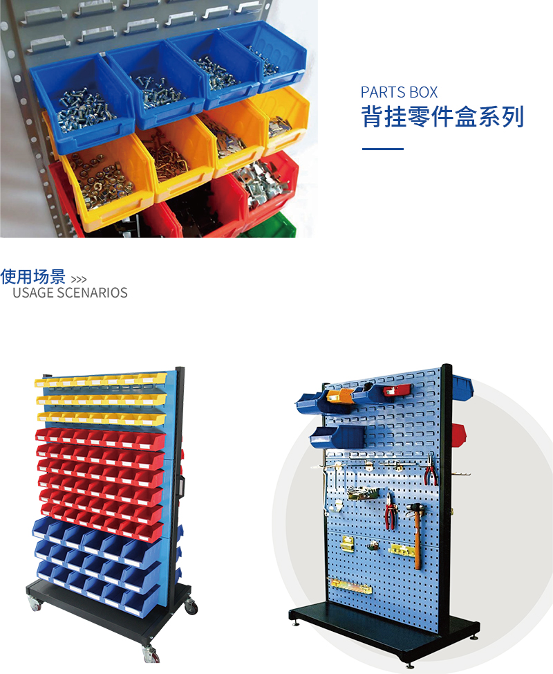 背掛零件盒采用全新共聚PP料制作,背后有掛槽設(shè)計,可懸掛于物料整理架和工作臺的掛板上使用。共5種規(guī)格,有紅、黃、藍(lán)3種顏色庫存。